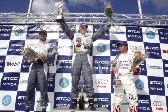 Prispallen i STCC-premiären på Knutstorp. Fr v tvåan Fredrik Ekblom, segrare Thed Björk och trean Tomas Engström